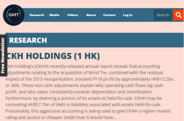 研究机构GMT Research发布沽空报告,称长和(00001.HK)近日发布的年报显示,与收购意大利电讯商Wind Tre相关的会计调整,加上2015年重组的残余影响,推动其2018财年利润增加了约132亿港元,涨幅达38%。