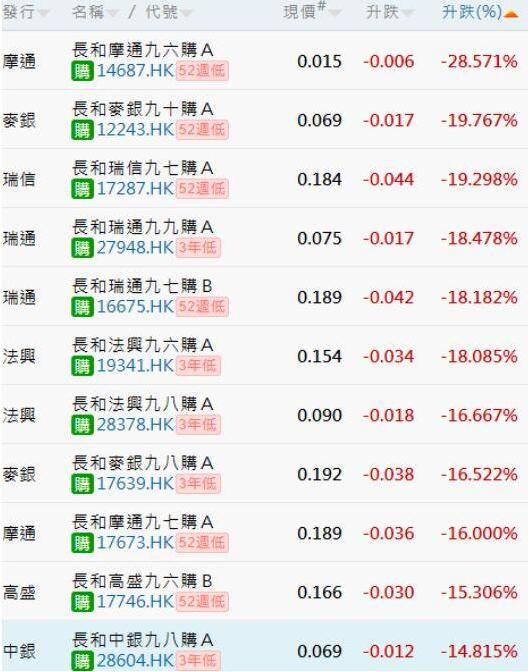 长和正股价格早盘一度以78港元价格低开,但随后有多头介入,全天以78.8港元收报,下跌1.19%。过去一年多时间,长和已经下跌近25%。长和认购证14日更是迎来集体暴跌,跌幅皆在14%以上,跌幅最大的长和摩通九六购A杀跌28.57%。