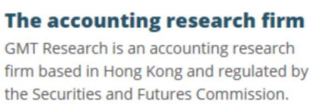 从其网站的信息来看,GMT Research介绍说,他们是一家会计研究机构,公司在香港,受证监会监管。从其从业历史来看,主要是以发现上市公司财务漏洞为主,并进行沽空。这有些类似于前些年著名的做空机构“浑水”。