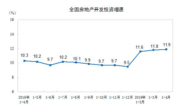 房地产投资数据继续上涨。国家统计局公布的数据显示,2019年1—4月份,全国房地产开发投资34217亿元,同比增长11.9%,这一数字也是过去一年以来的最高值。