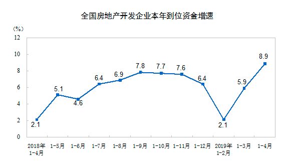 国家统计局数据亦显示,1—4月份,房地产开发企业到位资金52466亿元,同比增长8.9%,增速比1—3月份提高3个百分点。
