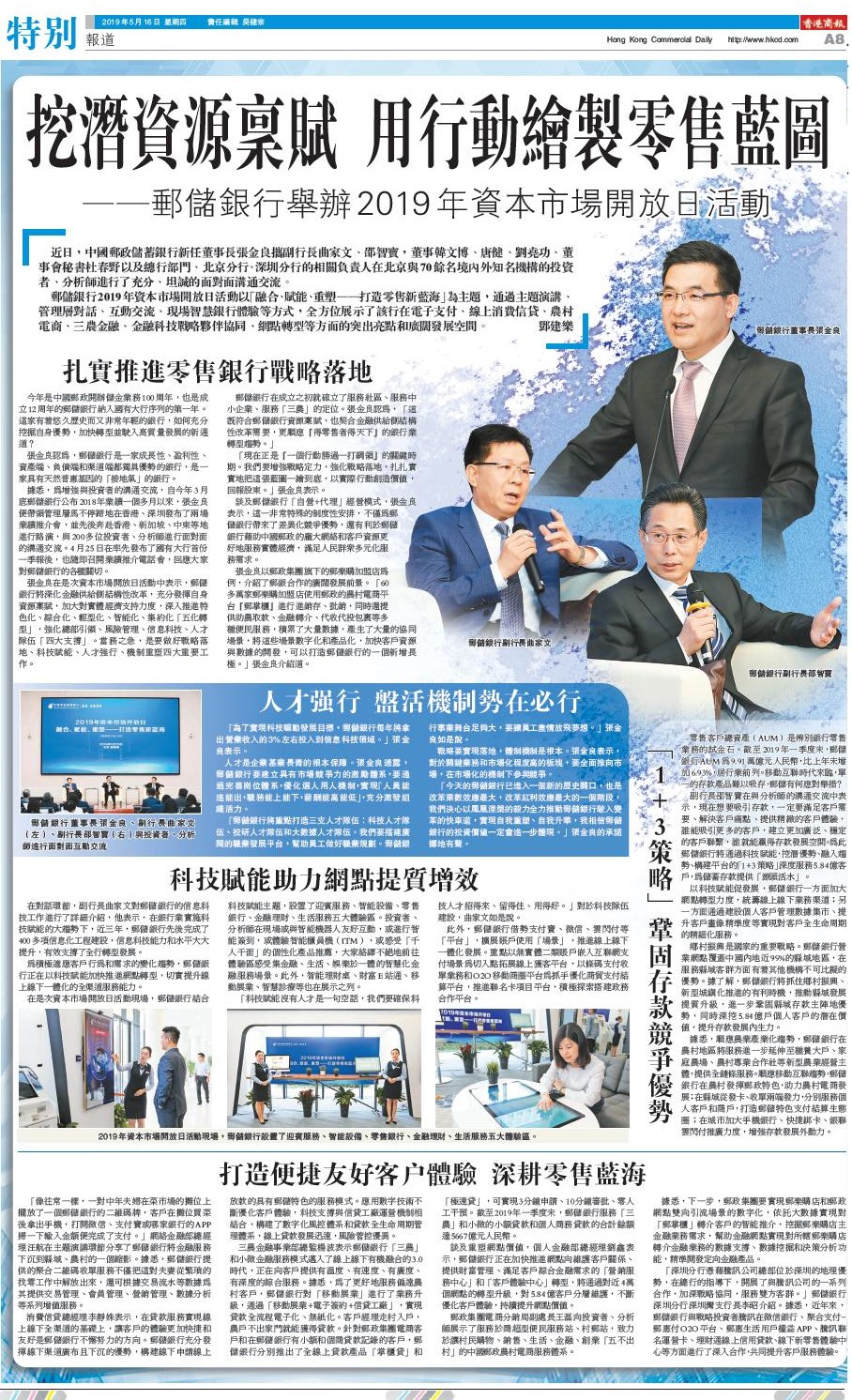 張金良在是次資本市場開放日活動中表示,郵儲銀行將深化金融供給側結構性改革,充分發揮自身資源稟賦,加大對實體經濟支持力度,深入推進特色化、綜合化、輕型化、智能化、集約化「五化轉型」,強化總部引領、風險管理、信息科技、人才隊伍「四大支撐」。當務之急,是要做好戰略落地、科技賦能、人才強行、機制重塑四大重要工作。