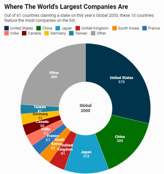 2019年全球上市公司2000强企业分布(图片来源:《福布斯》)