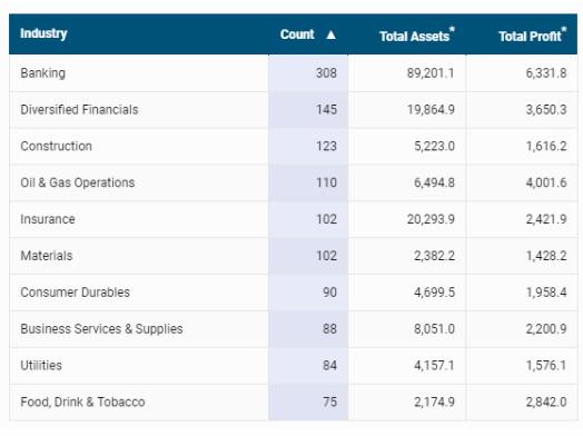 从行业分布来看,银行和金融业上榜企业最多,共有453家上榜,占据了榜单超五分之一的位置。建筑、石油和天然气行业上榜企业数量位列第三、第四位,分别有123家和110家。