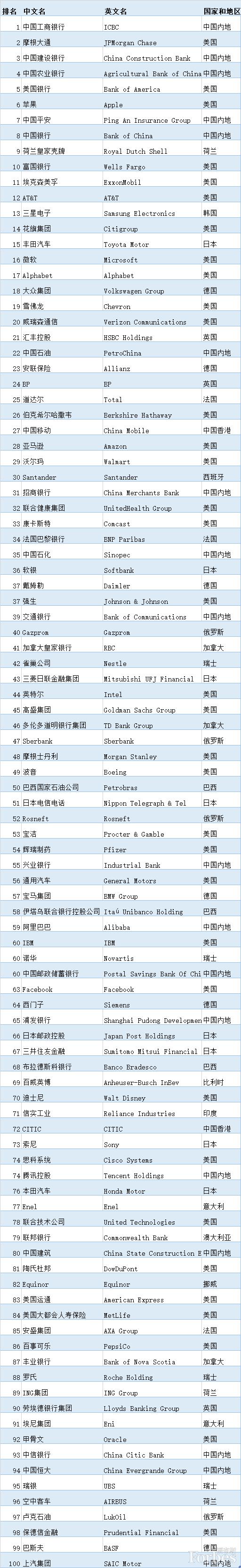 2019全球企业2000强 TOP 100 名单(来源:福布斯中国):