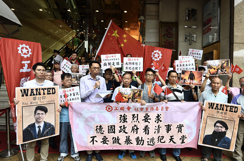 工聯會遊行到德國駐香港總領事館,抗議德國包庇旺角暴亂疑犯,要求德國尊重香港司法制度。