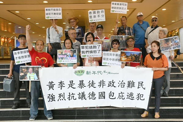 「新年代」一行人昨午高舉橫額「德國政府是非不分,罪犯逃跑了,我們憤怒了」,聚集於統一中心德國領事館地下示威。副召集人黃勵賢表示,黃台仰及李東昇因2016年農曆新年發生的旺角暴亂被捕,黃被控暴動、煽惑暴動及煽惑非法集結三罪,李被控暴動及襲警兩罪,兩人在保釋候審期間棄保潛逃,更是罪加一等。