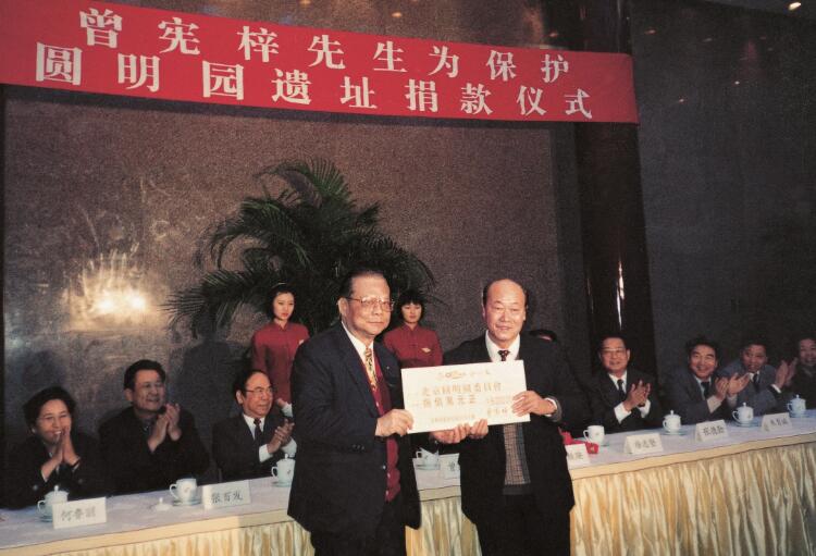 1993年3月,曾憲梓博士應邀來到圓明園參觀,當時的圓明園遺址幾乎看不到圍牆,遺址也沒有完全整修。目睹當時的圓明園滄桑遺址,為搶救、保護圓明園遺址,建設遺址公園,曾憲梓博士當即表示為修復圓明園圍牆捐資人民幣800萬元。