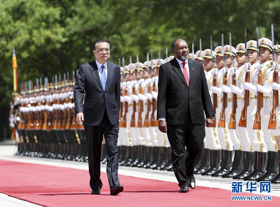 5月27日,国务院总理李克强在北京人民大会堂同瓦努阿图总理萨尔维举行会谈。这是会谈前,李克强在人民大会堂东门外广场为萨尔维举行欢迎仪式。 新华社