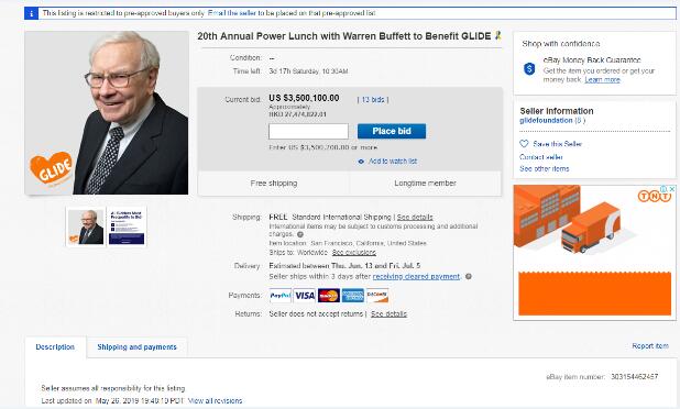 Ebay數據顯示,周一曾有人給出360萬美元報價,不過隨後主動撤單。距離6月1日的競拍結束還有幾天時間,按目前趨勢來看,今年股神的午餐極可能是天文數字。