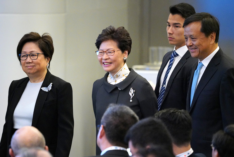 港交所第二屆生物科技峰會昨在香港金融大會堂舉行,行政長官林鄭月娥(中)在港交所集團主席史美倫(左)和港交所行政總裁李小加(右一)的陪同下出席峰會。 中新社