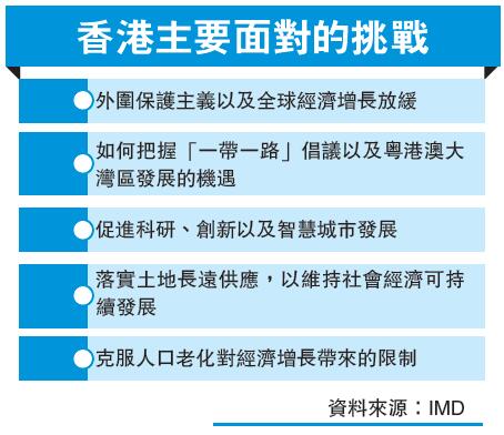同時,IMD亦認同貿易發展局早前提出的意見,2019年香港面對的5項主要挑戰,包括外圍保護主義以及全球經濟增長放緩、如何把握「一帶一路」倡議以及粵港澳大灣區發展的機遇、促進科研、創新以及智慧城市發展、落實土地長遠供應,以維持社會經濟可持續發展、克服人口老化對經濟增長帶來的限制。