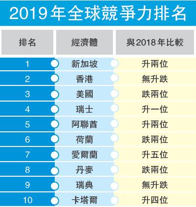 【香港商報网訊】記者姚一鶴報道:瑞士洛桑管理學院(IMD)昨日發表2019年全球競爭力報告,新加坡上升兩級排名第一,香港排名維持在第二,美國就由去年的第一位跌至第三,顯示美國總統特朗普的減稅振興經濟方案失色。中國內地排在第14位,台灣則排名全球第16。