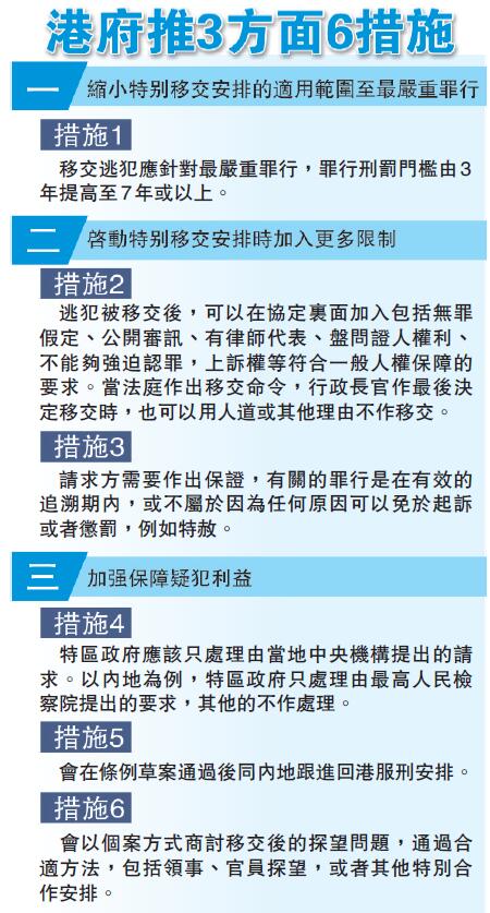 【香港商報网訊】記者馮仁樂、萬家成報道:39名建制派立法會議員5月29日向保安局局長李家超提交聯署信提出兩項建議(包括將移交罪行刑期門檻增至7年或以上、必須由中央機關或部門向特區政府提出引渡要求)後,特區政府不到24小時迅即作出回應──昨日傍晚,李家超就修訂《逃犯條例》會見傳媒,指政府在聽取各方意見後,決定就修訂《逃犯條例》提出三方面共六項措施,包括提高移交刑期的門檻至7年或以上、當啟動移交時會加入更多限制,以及加強保障疑犯利益等。