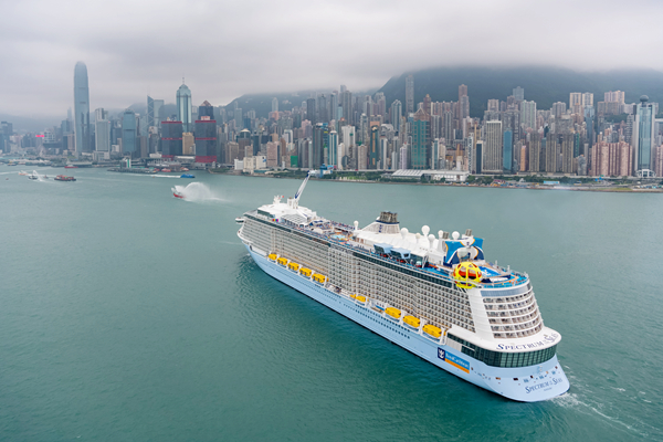 造價12.5億美元、皇家加勒比國際遊輪旗下的「海洋光譜號」於昨日午前首度經港海西邊駛入本港,停泊啟德郵輪碼頭,隨即在碼頭舉行盛大慶典,邀請了商務及經濟發展局局長邱騰華、旅發局總幹事劉鎮漢、旅遊業議會主席黃進達等人擔任主禮嘉賓。