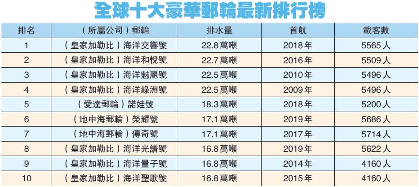 這艘號稱亞洲最豪華,比鐵達尼號大4倍,單是工作人員就有1000人的大船設有2137間客房,當中包括有逾2000呎的頂級家庭套房,配備樓高2層的私家室內滑梯。船上也有不少娛樂設施,其中有海上首個結合VR的笨豬彈床「南極球」,旅客可戴上VR眼鏡,跳彈床以身體進行遊戲。