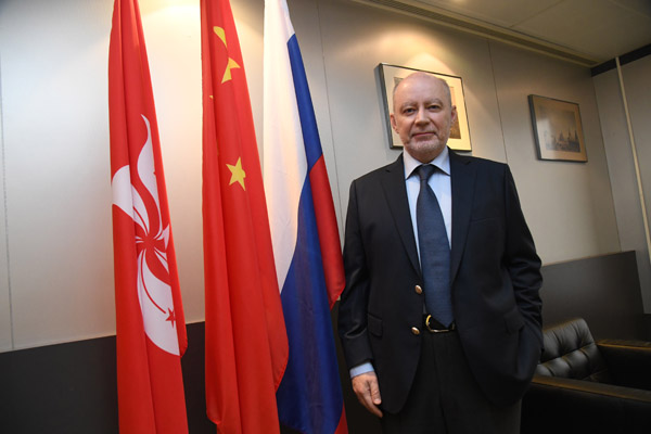 俄羅斯駐港總領事科茲洛夫接受本報專訪時表示,香港可更主動在「一帶一路」及大灣區建設中發揮 「超級聯繫人」 的作用。 記者 崔俊良攝