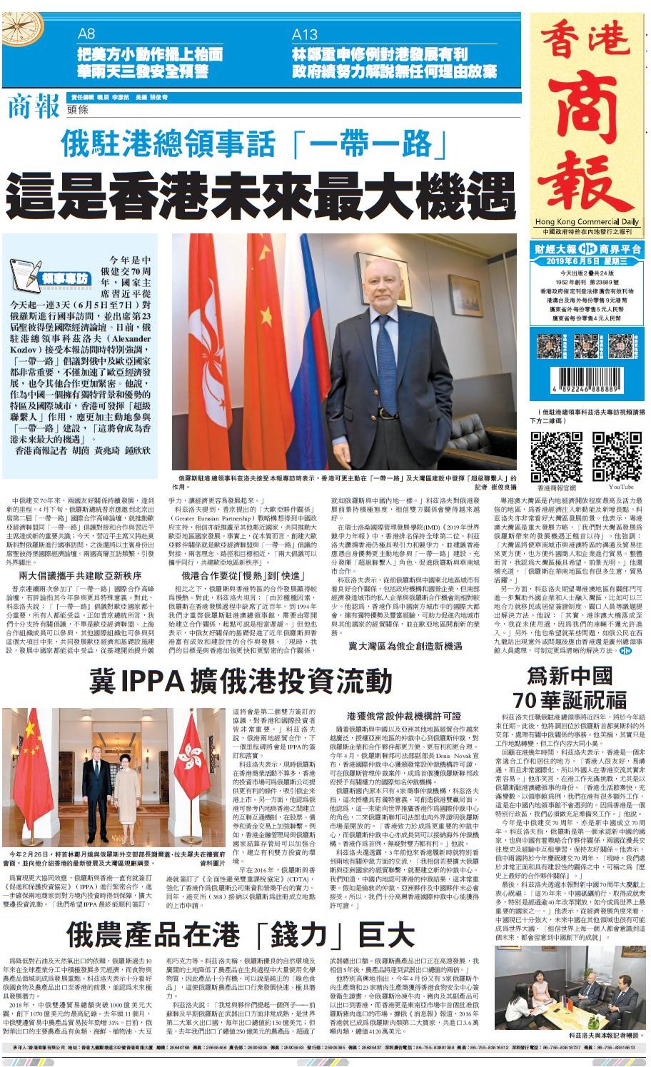 今年是中俄建交70周年,亦是新中國成立70周年。科茲洛夫指,俄羅斯是第一個承認新中國的國家,也與中國有戰略合作夥伴關係,兩國從漫長交往歷史及經驗中互相學習,保持友好關係。他表示,俄中兩國將於今年慶祝建交70周年,「現時,我們處於非常正面和具有建設性的關係之中,可稱之為『歷史上最好的合作夥伴關係』。」