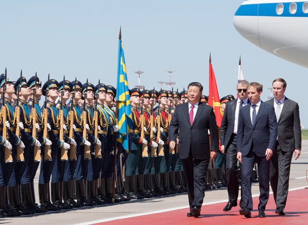 6月5日,国家主席习近平乘专机抵达莫斯科,开始对俄罗斯联邦进行国事访问。俄方为习近平主席在机场举行迎接仪式。习近平检阅俄罗斯三军仪仗队及分列式。新华社