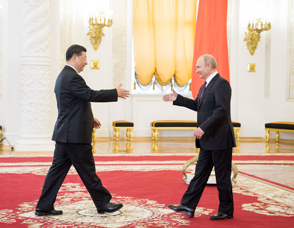 6月5日,国家主席习近平在莫斯科克里姆林宫同俄罗斯总统普京会谈。这是两国元首在会谈前握手。 新华社