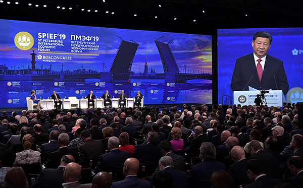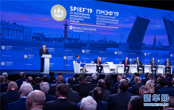 6月7日,国家主席习近平在圣彼得堡同俄罗斯总统普京一道出席中俄能源商务论坛。 新华社