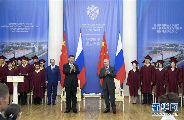 6月6日,国家主席习近平在圣彼得堡出席接受圣彼得堡国立大学名誉博士学位仪式。俄罗斯总统普京出席仪式。新华社