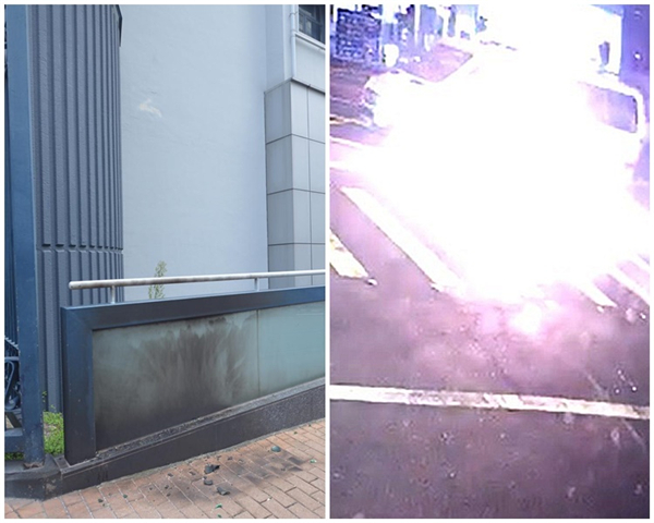 灣仔總部外警車(右)及跑馬地警署(左)今日先後被人擲汽油彈。