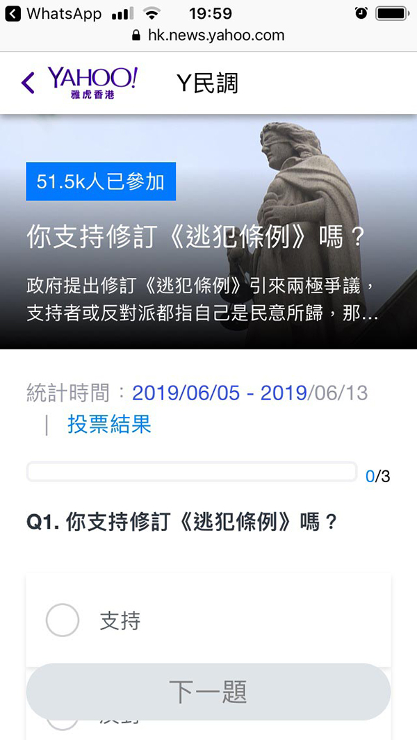 網站雅虎香港有一項名為「你支持修訂《逃犯條例》嗎?」的民調,主要調查市民對修例的看法,設有「支持」、「反對」及「中立/無意見」供讀者選擇,民調餘下部分則是簡單的個人資料,包括性別及年齡層。