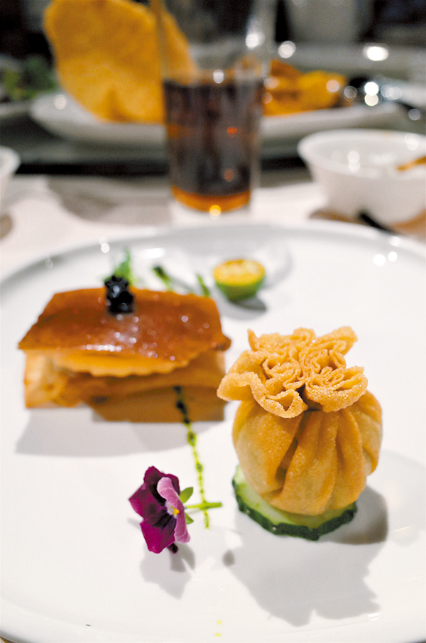 在品嘗的多款菜式中,最令人驚喜的是「魚子醬片皮鵝拼黑松露石榴球」,鵝皮口感香酥,最下層春卷皮香脆,加上夾在中間的蓮霧、蜜瓜及最頂層的魚子醬,口感獨特又清新。餐廳亦不少得傳統潮州美饌,如「筍絲炒魚麵」,魚麵雖與魚丸一樣用魚肉製成,卻更有勁道,筍絲口感爽脆,老少皆宜。