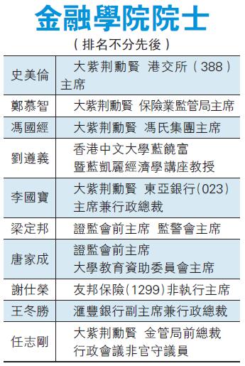 由金管局牽頭成立的金融學院昨在港成立,財政司司長兼金融學院榮譽院長陳茂波(右四)與香港金融管理局總裁兼金融學院董事會主席陳德霖(左四)等嘉賓出席成立典禮暨院士頒授儀式。中新社