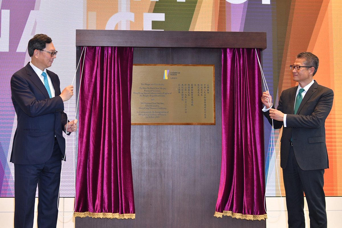 陳茂波(右)與金融管理局總裁兼金融學院主席陳德霖主持金融學院成立典禮。香港政府新闻网
