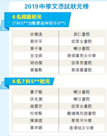 【香港商報网訊】記者馮煒強、實習記者黃港俊、葉佩瑜、馮仁樂報道:2019年中學文憑試(DSE)放榜,今屆共誕生12名考獲7科5**狀元,當中6人在數學延伸部分亦考獲5**成為超級狀元,是歷屆最多。12名狀元包括9男3女,分別來自9間學校。九龍塘喇沙書院誕生3名狀元成大贏家外,傳統名校今年繼續有狀元誕生,包括2人來自拔萃女書院,拔萃男書院、聖保羅男女中學、皇仁書院及香港培正中學,均分別誕一名狀元,而觀塘瑪利諾書院、筲箕灣聖馬可中學及中西區聖保羅書院則首誕狀元。今年的狀元中絕大部分希望從醫,包括9人想讀醫科、1人想讀牙醫。