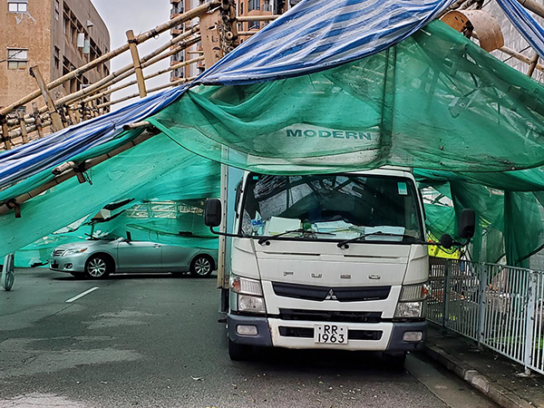 昨日中午12時許,元朗德業街19號元朗物流中心外牆一幅16米乘60米的棚架,在大雨中突然倒塌,整幅棚架橫亙在2條行車線上,當時有一輛私家車、一輛貨車及一輛石油氣車被困棚架內,其中貨車及石油氣車早前已停泊該處,車內無人,而私家車上姓劉司機(54歲)則駕駛私家車載友人,剛駛至上址時棚架隨即突然塌下,發出隆然巨響,2人嚇得瞠目結舌,驚魂甫定後發現部分棚架被一枝燈柱擱起,沒有擊中私家車車頭位置,2人均無受傷,但因司機位的車門損毀無法打開,劉和友人從乘客位爬出逃生,大難不死。警方稍後到場,封鎖德業街2條行車線,有待工人到來清理。