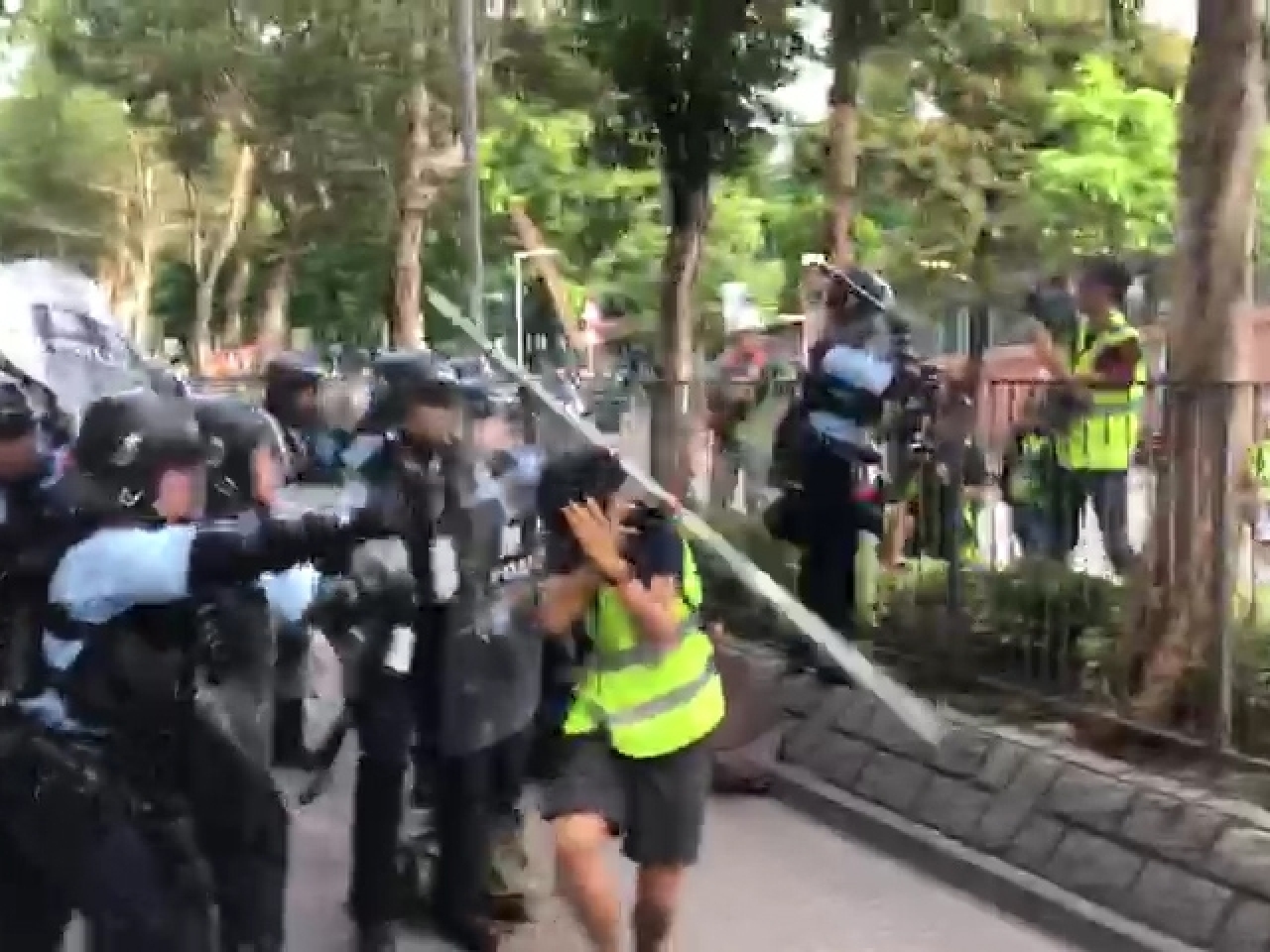 上水遊行後,一批示威者衝擊警方防線,其中一名戴上口罩、右臂纏保鮮紙的青年用雨遮插向警員。記者崔俊良攝