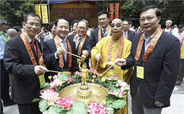 釋智慧(右二)長年致力弘揚佛教,圖為他於2012年參與浴佛儀式的情況。