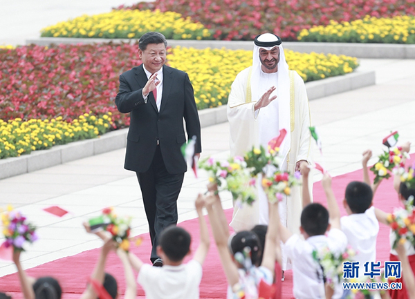 7月22日,國家主席習近平在北京人民大會堂同阿聯酋阿布扎比王儲穆罕默德舉行會談。這是會談前,習近平在人民大會堂東門外廣場為穆罕默德舉行歡迎儀式。 新華社記者翟健嵐攝
