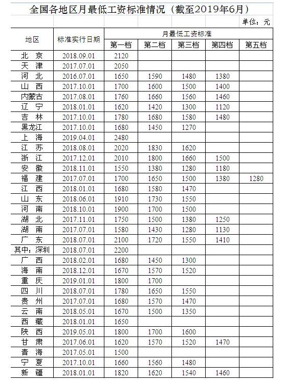 7月24日,人社部官網更新全國各地區月最低工資標准情況和小時最低工資標准情況(截至2019年6月)。數據顯示,上海月最低工資標准為2480元,為全國最高。