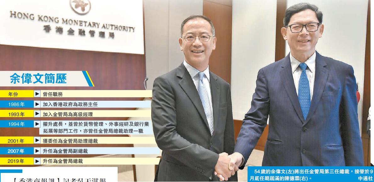 【香港商報网訊】記者吳天淇報道:政府昨日宣布,委任54歲的余偉文為金管局第三任總裁,接替將於9月底任期屆滿後退任的陳德霖,10月1日生效。余偉文表示,現時金融環境非常複雜,首要工作是維持香港金融穩定,以及鞏固香港的國際金融中心地位。