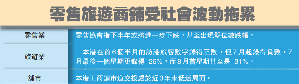 反修例示威遊行持續,不僅影響本港零售旅遊業,對商舖地產交投也引發漣漪效應。旅客減少,商舖生意難做,而企業擴展計劃也因此擱置,連鎖反應之下,商舖租金承受壓力,買賣也面臨整頓,業界料核心區域舖租或對半砍價。