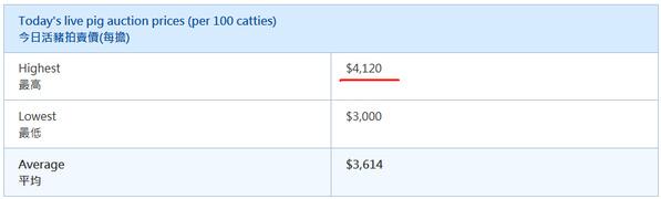 他还说:「以前香港一天杀4000多只猪,现在只杀1000多只,而且每100斤要4000多港元(折合约3590元人民币),难以减价销售。他预计高猪价仍会维持一段长时间,谨慎估计到新年才会回落。」