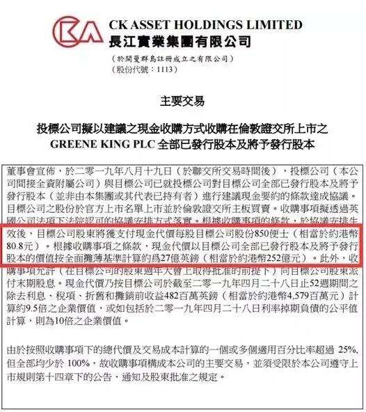 英国《金融时报》20日称,根据协议,长实,以每股8.5英镑收购格林王,总计支付27亿英镑。此外,长实承担格林王19亿英镑债务。包括债务在内,此项交易价值46亿英镑。消息公布后,格林王的股票上涨超过50%。