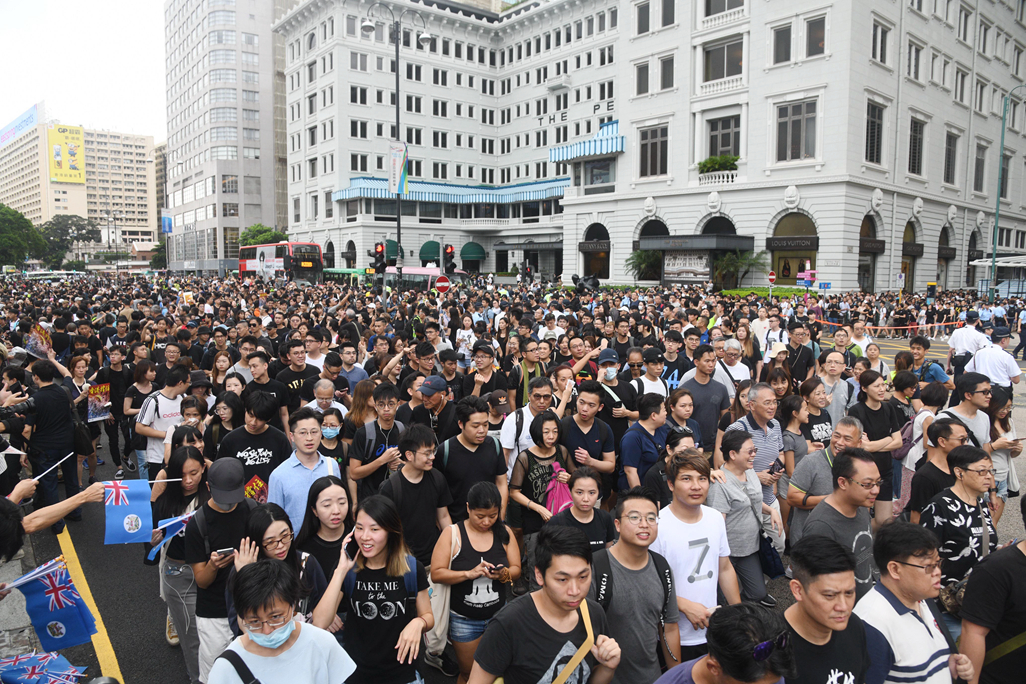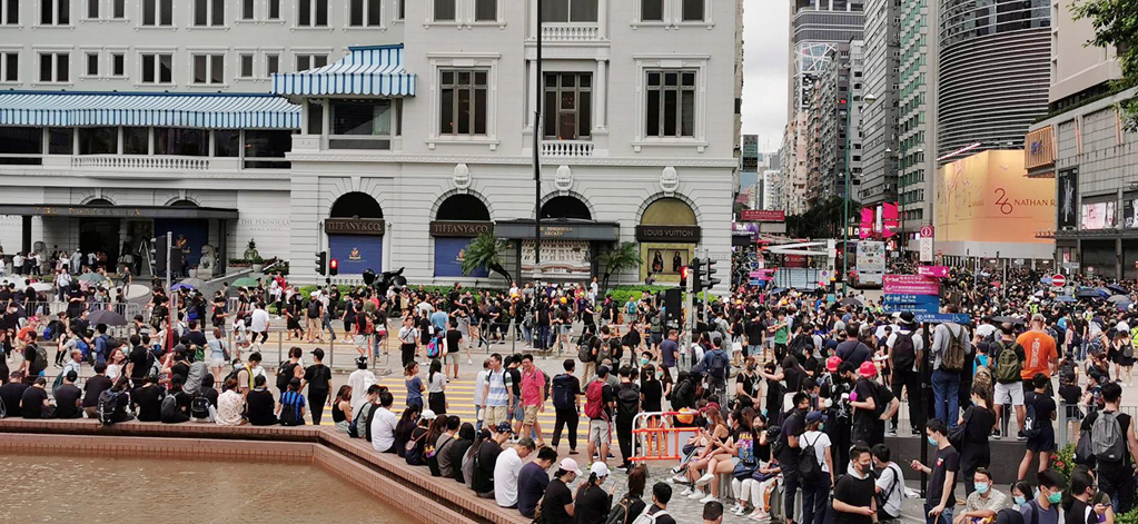本港酒店因近期示威遊行入住率大減。圖為日前旺角遊行示威者佔領半島酒店一帶,令行人和酒店客人不知所措。資料圖片