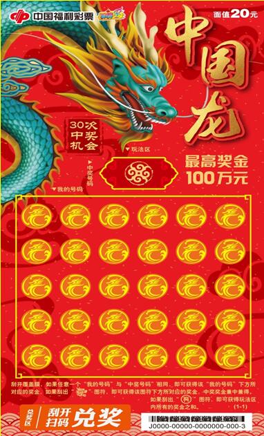「龍」,是中華民族的象徵,是華夏女兒祈求平安和幸福的精神嚮往,「祥龍送福」也成為根植在中國人心中的美好願望。福利彩票刮刮樂新票「中國龍」,整體顏色採用中國紅,加以黃色搭配,恰與國旗的紅、黃相協調,以龍為主要元素,底部的雲層與祥雲,使得龍的形象翱翔於天空,隱喻祖國一飛衝天。「中國龍」面值20元,返獎率65%,最高獎金100萬元。