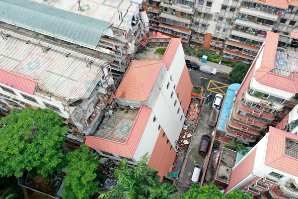 倒塌樓房傾斜壓到旁邊的樓房,被壓樓房亦損毀嚴重。