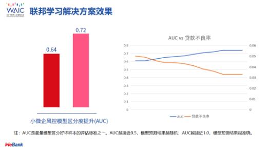 虽然联邦学习的框架最近才提出来,但是它在产业界的应用已经有成熟的进展。比方说我们最近在一个金融信贷的场景下就取得了非常成功的应用:一方是互联网企业,有很多用户的行为数据;另一方是金融企业——银行,需要建立一个更准确的用户信贷模型。这时利用纵向联邦学习,把两边的模型加以共享,进行更新,这样模型就能够更有利,随着数据量的增加,效果也大为增加。以下是效果图。