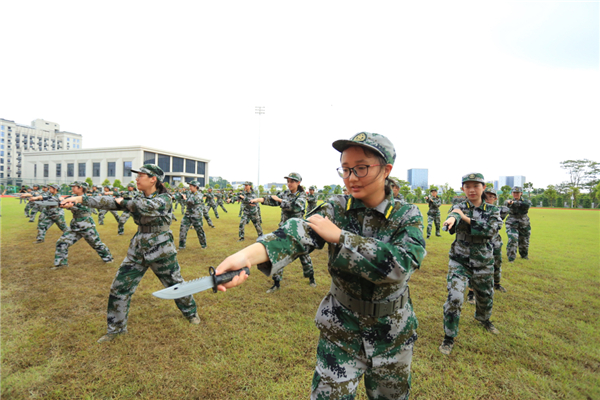 今年深北莫的軍訓除了常規的站軍姿、踢正步,軍體操等傳統項目外,還引進了防恐、防暴、應付突發公共安全事件等新內容。2019級全體學生以飽滿的精神、昂揚的鬥志和矯健的身姿向參加檢閱的領導及嘉賓展示了過去8天的軍訓成果。