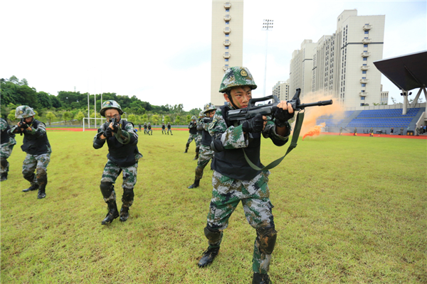 【香港商報网訊】記者林麗青報道:防恐防暴、短兵對抗、解救人質、護衛國旗……8月31日,一幕幕扣人心弦、震撼逼真的演練場面在深圳北理莫斯科大學體育場陸續上演。當天,該校舉行了「我和祖國共成長」主題教育活動啟動儀式暨2019級本科生軍訓結業典禮。該校代理校長唐水源,黨委書記、副校長陸萬偉,學校部分管理幹部及教師,2019級全體本科學生,軍訓指揮部全體帶隊幹部出席結業典禮。