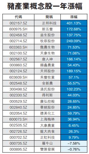 3日,中國豬肉價格依然處於高價,不少城市的豬肉價格高達31元人民幣/公斤。加上廣西南寧對豬價進行「地產式調控」的影響,豬肉板塊當天大漲。其中正虹科技開盤後不久封漲停,報6.91元/股;立華股份截至收盤上漲3.59%,報77.00元/股;天邦股份報13.29元/股,上漲3.83%;龍大肉食報9.82元/股,上漲2.83%;大北農報5.64元/股,上漲2.17%;溫氏股份報41.3元/股,上漲0.61%。