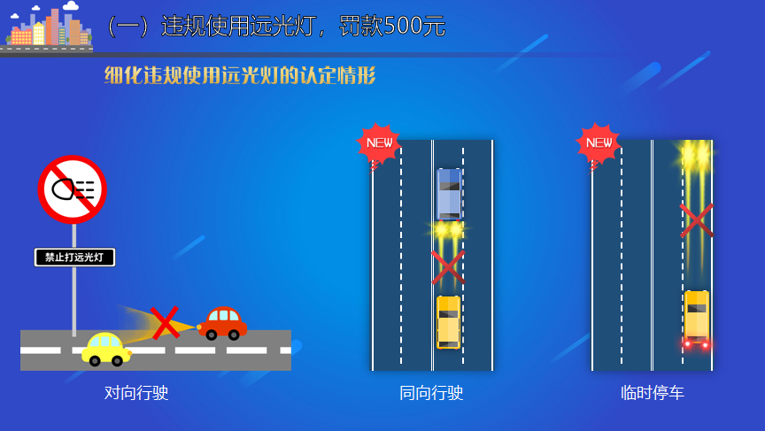 本次條例修訂注重倡導文明行車,強調對讓行、通行規則嚴格遵守,具體修訂的條款包括亂變線、亂用遠光燈、斑馬線不禮讓行人等。明確指出違規使用遠光燈,原來罰款300元,今後罰款500元。細化了違規使用遠光燈的認定情形,包括將同方向行駛的後車與前車近距離行駛時使用遠光燈的、臨時停車使用遠光燈的,都認定為違規使用遠光燈;同時,不按規定變道,包括一次變更到不相鄰車道的、變道轉彎或者臨時停車不按規定打燈以及轉彎車輛不禮讓行人的均罰款500元。