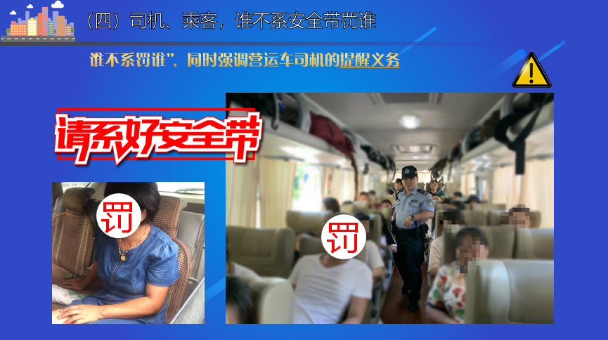 本次修訂針對需要重點管理的違法行為,以前沒有規定的進行了補充規定,對於以前有規定的進行了完善規定,主要條款包括不系安全帶、買賣分、電動單車違法、載客超員等。其中,處罰不系安全帶有新規,司機、乘客,誰不系罰誰。但,營運司機應提醒乘客系安全帶,否則給予處罰。按照「誰不系罰誰」的理念進行處罰,同時強調了營運車司機的提醒義務,保障行車安全。